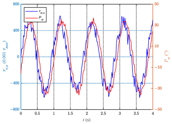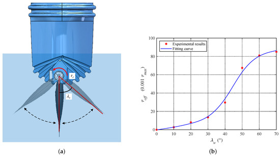 Figure 9a shows a schematic diagram of the waterproof latex skin at the tail end. The waterproof skin is designed with multiple creases at the tail end to provide space for the tail joint’s motion. When the creases are stretched or compressed, there is a restoring force that returns them to their original shape. The magnitude of this restoring force is positively correlated with the deflection angle of the fluke. In addition, there is friction introduced into the movement due to the planetary reducer, coupling, and bevel gearbox connecting the fluke and the motor output shaft. The factors affecting the joint frictional force are numerous and difficult to model accurately. This paper collectively refers to the two types of forces mentioned above as resistance. From the experimental results, it can be seen that the restoring force of the waterproof skin mainly contributes to the resistance, while the joint frictional force accounts for a small proportion.