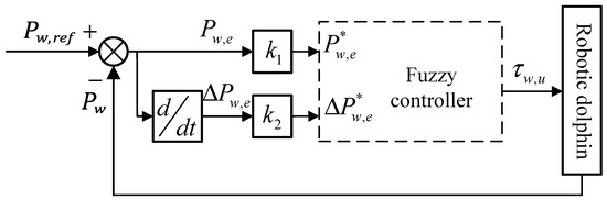 The main purpose of the fuzzy inference system is to generate the control torque of the caudal joint based on the position error of the caudal joint angle. This paper adopts a dual-input single-output fuzzy mapping structure. As shown in Figure 10, the dual input variables are the position error and the rate of change of position error , while the single output is the desired torque . represents the desired position, and represents the current actual position returned by the motor driver. Here, and , respectively, denote the discrete values at time . The position error at time and its rate of change are calculated as follows: