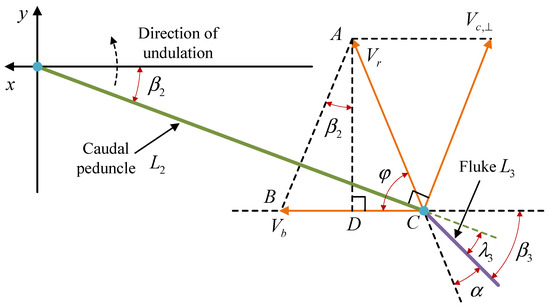 Schematic diagram of the relationship between the caudal peduncle and the fluke under motion.