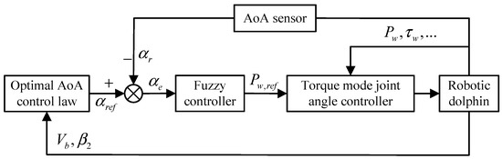 Therefore, we establish a closed-loop control algorithm for the caudal joint based on AoA feedback, as shown in Figure 12. Firstly, based on the internal state data of the robotic dolphin, we use the optimal AoA control law to calculate the expected AoA for the current control cycle. Secondly, we use the feedback data from the AoA sensor to calculate the AoA deviation and design a fuzzy controller to map to the expected angle of the caudal joint. The fuzzy control process is similar to the design approach in Section 4 and will not be repeated here. Finally, we adjust the angle of the caudal joint to the expected value.