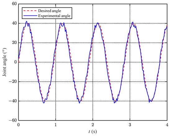 Based on the above experimental environment, this section designs three types of experiments—static, anti-interference, and swimming—to verify the torque mode fluke joint angle control algorithm. The aforementioned experiments are conducted using the control scheme depicted in Figure 8. In the experiment, a control command is generated every 20 ms, and the sensor data acquisition is synchronized with this interval. Considering that some modules in the control block are provided by the motor driver manufacturer, it was challenging to collect and compare data from these modules. Therefore, in this section of the experiments, only joint angle data were compared. To quantitatively evaluate the control effect, the average error between the actual joint angle and the expected joint angle is adopted.