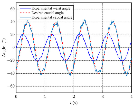 To verify the effectiveness of the proposed torque mode joint angle control algorithm during motion, we conducted dynamic experiments on the bionic robotic dolphin. In the dynamic experiment, the waist motor rotated at a uniform speed and the fluke flapped at a frequency of approximately 1 Hz. The motion law of the waist joint was assumed to be a sine wave, and the fluke moved at a phase difference of with an amplitude of 40, which matched the waist joint motion. Figure 16 shows a comparison of the waist and caudal joint angles in the dynamic experiment. As can be seen from the figure, although the waist motor moved uniformly, the curve of the waist joint was not smooth since the designed switching mechanism was a force lever that amplified changes in external loads. After calculation, the average error of the caudal joint angle in the dynamic experiment was , which increased compared to the static experiment but still met the control requirements.