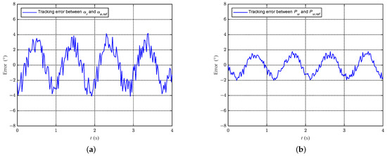 Before conducting the aforementioned two experiments, we first analyzed the tracking errors in the AoA feedback experiment. The experimental setup was similar to the dynamic experiment described in the previous section, with the waist joint rotating at a constant speed and the fluke flapping at approximately 1.0 Hz. From Figure 17a, it can be observed that the mean tracking error between and is 1.95. In comparison, Figure 17b shows that the average tracking error between and is 0.99. There may be two reasons for this phenomenon. Firstly, the AoA for the fluke is obtained from a self-made sensor, while the joint angle is directly acquired from the encoder of the motor, which has better accuracy and stability. Secondly, the AoA is part of the outer loop in the control framework, and, compared to the inner loop variable, the outer loop variable is more prone to accumulating errors.