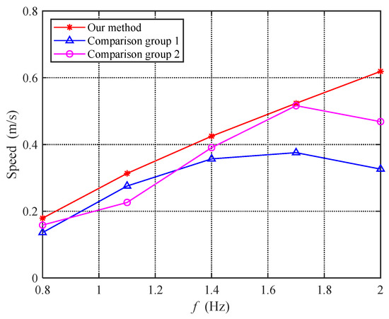 Figure 19 shows the speed analysis of the above three experiments. As can be seen from the figure, the speed achieved by the proposed method is superior to that of the comparison group at all frequencies. However, the main purpose of this study was not simply to compare swimming speeds, since there must be a set of parameters that perform better for certain frequencies than the proposed method. Looking at the two lines of the comparison group, each performed outstandingly at some frequencies, but, after exceeding the optimal frequency range, the growth in swimming speed was no longer significant. At high frequencies, the comparison group even experienced a decrease in swimming speed. On the other hand, the proposed method achieved a good mapping between the stroke frequency and swimming speed over a wider frequency range, which is difficult to achieve with current motion strategies based on fixed control laws.