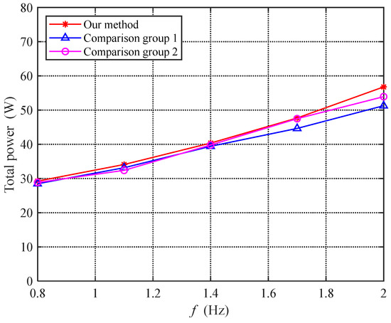 To further analyze the effectiveness of the proposed method, this section tested the swimming power of the bionic robotic dolphin. The acquisition of power depends on the current feedback function of the motor driver. Specifically, the motor driver uses a first-order low-pass filter with a cutoff frequency of 50 Hz to filter high-frequency current data and feed back the current average value to the data collection and processing unit at a maximum sampling frequency of 200 Hz. Then, the data processing unit uses a moving average filtering method to denoise the collected current information and calculates the total power consumption of the bionic dolphin under different experimental conditions. Figure 20 shows the comparison of the total power consumption of the three experiments at different frequencies. As can be seen from the figure, the power consumed by the three experiments is very similar. Therefore, the impact of the proposed method on power consumption is very limited.