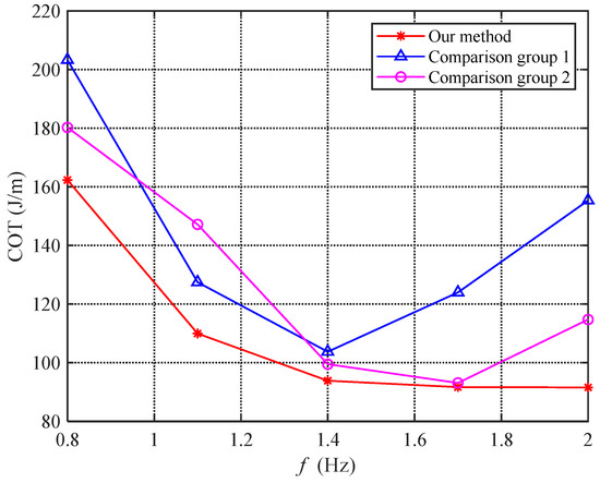 Comparing the results in Figure 19 and Figure 20, we can see that the speeds are different even when the total power consumption is the same. Therefore, we introduce the concept of the cost of transport (COT) to measure the propulsion efficiency of the bionic robotic dolphin. COT = , which indicates the ratio of power consumption to speed and is often used to measure the energy consumed by a robot per unit distance traveled. The lower the COT value, the higher the propulsion efficiency.