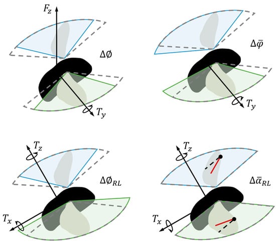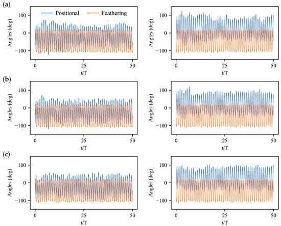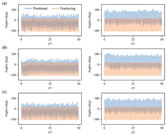 Wing kinematics manipulations of left and right wings under angular velocity perturbations: (a) Roll perturbation along body axis of ; (b) Pitch perturbation along body axis of ; (c) Yaw perturbation along body axis of .