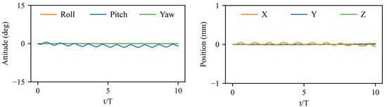 The trimmed state of a hovering bumblebee is illustrated in Figure 5, which reaches a stable periodic state with initial trimmed wing kinematics and maintains equilibrium without perturbation for 10 strokes. A slight body oscillation is induced by the symmetric reciprocation motion of the two flapping wings (Figure 1), involving pitch motion, forward/backward motion, and vertical motion. The goal of flight control is to restore the attitude and position of the bumblebee after disturbances to (°) and (mm). In our control results, all the pitch angles have been illustrated as .