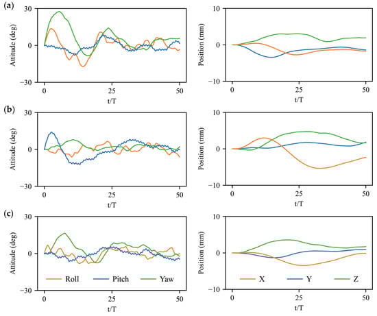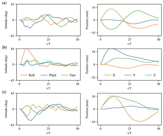Attitude and position control results under angular velocity perturbations: (a) Roll perturbation along body axis of ; (b) Pitch perturbation along body axis of ; (c) Yaw perturbation along body axis of .