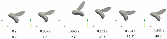 The rotational control based on DRL policy can be achieved at around 20 wing-beat strokes, which is slightly slower than the experimental observations on various insect flights [1,2,3,9,10]. More restoring time of approximately 40–50 strokes is needed to obtain the translational control after large perturbations, which may be less essential compared with the attitude stabilization [33]. The gust rejection and flight profile after the disturbance can be visualized through the dynamic sequence of the bumblebee motion, for instance, the detailed control process with the variation of body rotation and movement after vertical velocity perturbation in the direction of in Figure 8. The hovering bumblebee in equilibrium (0 s) encounters a vertical velocity disturbance at the initial stroke cycle (~0.007 s) resulting in a rapid movement in the vertical direction. After one stroke time delay, it takes active wing kinematics manipulations for several flapping cycles, during which the bumblebee first pitches down 40° and restores the body attitude quickly within 0.161 s. The pitch response of the bumblebee induces the backward and forward motion of the body, which takes more stroke cycles to return to the initial position. Although the translational control requires relatively more restoring time due to the indirect adjustments from an action space of 4 under full 6-DoF disturbances, the underactuated DRL controller has great potential to simplify the actuator-based fabrication in flapping-wing MAVs.