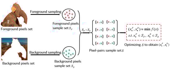 In the image above, represents an RGB image, and correspond to the known foreground, background, and unknown regions in the trimap respectively. is the decision space composed of foreground and background samples, which is denoted by . Finally, the evaluation function is used to determine the fitness value of each pixel pair, and the pixel pair with the best fitness is selected as the optimal pixel pair , based on the criteria shown in Equation (4):