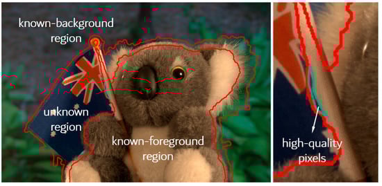 where is the alpha matte of the foreground object at pixel , and . Specifically, takes 1 when belongs to the foreground, it is assigned a value of 0 when belongs to the background, and assigned a specific value in the range (0,1) when is a semi-transparent pixel of which the color is a mixture of a foreground pixel color and a background pixel color. As both and are three-dimensional unknown vectors and is an unknown scalar, Equation (1) is an ill-defined problem. In order to accurately determine the value of , Rhemann et al. [] introduced a trimap, which divides the image into three non-overlapping regions, denoted as the known foreground, known background, and unknown regions, to impose additional constraints on the image matting problem, as shown in Figure 1 (where is the foreground region with , is the background region with , and is the unknown region with in the range (0, 1)).