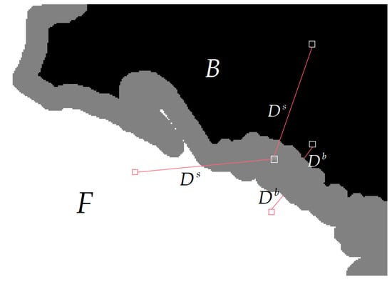 In image matting, the spatial positions of pixels can reflect their structural features, which may help in the differentiation of the pixels. For this purpose, the similarity between the unknown region and the known boundary pixels, as well as the similarity between the unknown region and the long-range known regions (as shown in Figure 4), are calculated using the expressions shown below: