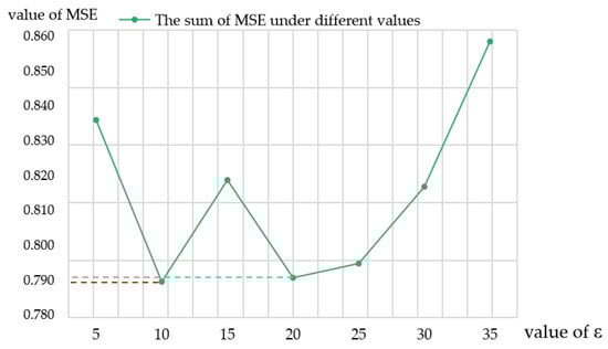 In the MCSS, the spatial coordinates and color features of the pixels were sampled by solving Equations (8) and (9). Using Equation (9), pixels whose color distance was less than were considered candidate samples. In order to determine the optimal value of , we calculated the matting results under different distances. Figure 5 shows the sum of the MSE values of the 27 alpha matting training sets based on 1% computing resources and the different values of . The results show that when the color distance parameter was assigned the value of 10 (the red corresponds to the dashed line), the total MSE based on all 27 images was the smallest with a value of 0.789, i.e., the alpha matte accuracy was the highest. Therefore, the color distance parameter was set to 10 in the MCSS.