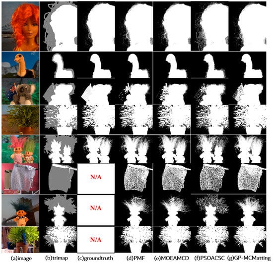 The comparison and analysis of the experimental results in Section 5.4 fully reflect the superiority of the proposed algorithm under conditions characterized by limited computing resources. However, the results reported in Table 3 in Section 5.4 show that the extraction accuracy of the GP-MCMatting algorithm was low when applied to the GT15 and GT24 images, and there were failures in the acquisition of high-quality pixel pairs, as shown in Figure 7.
