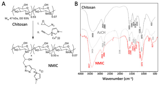 (A)—Synthesis scheme of NMIC chitosan derivatives. (B)—FTIR spectra of chitosan and its derivatives.