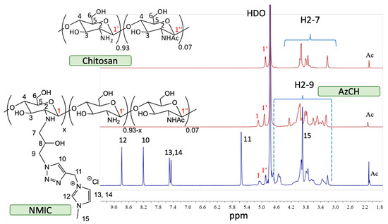 The 1H NMR spectra are presented in Figure 2. The starting chitosan material had typical polysaccharide signals (H2-7). Anomeric protons signals H1′ from free glucosamine were presented. After chemical modification, the intensity of H1′ decreased due to the formation of the N-substituted product AzCH. A new signal H1 and additional signals in H2-9 region appeared. The 1H NMR spectrum of NMIC showed new N-methylimidazole (H12 8.79 ppm) and triazole (H10 8.21) signals. Additional signals of −CH=CH− (H13 and H14 at 7.5 and 7.46 ppm) and CH3 (H5 at 3.9 ppm) from methylimidazole were observed. A singlet (H11 5.56 ppm) from CH2 was also presented.
