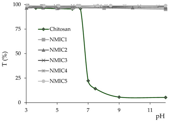 The solubility was determined for the pH range of 3.0–12.0 by the method of turbidimetric titration. NMIC (10 mg) was dissolved in 5 mL of 1% acetic acid, and the solution was gradually titrated with NaOH (2 M) to the final pH with constant stirring. The obtained values were recorded using an HI 8314 pH meter (Hanna Instrument, Smithfield, RI, USA). Absorbance measurements of the solutions were taken at λ = 600 nm in quartz cuvettes (1 cm) on a Specol spectrophotometer (Analytik Jena, Germany) [33].