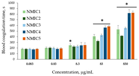 Blood recalcification time (s) during incubation with NMIC derivatives. * p < 0.05—the reliability of differences with the indications in the control without adding samples (0 mg/mL; 187.19 ± 10.76 c); n = 6.