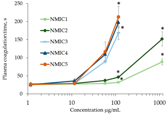 The effect of NMIC derivatives on the coagulation of platelet-poor human plasma during the activation of factor XII by ellagic acid in the presence of soy phospholipids and calcium ions was studied in the APTT test [36]. At concentrations of 1.163 µg/mL and 11.630 µg/mL, the samples did not affect human plasma coagulation. With an increase in the concentration of NMIC derivatives, the plasma coagulation time in the APTT test significantly increased compared with the control (0 µg/mL: 30.96 ± 0.89 c) (Figure 5). The anticoagulant activity of the samples was manifested starting from a concentration of 58.140 µg/mL for NMIC5, with a concentration of 116.280 µg/mL for NMIC2, NMIC3 and NMIC4 and with a concentration of 1162.800 µg/mL for NMIC1. With an increase in the degree of substitution, the plasma coagulation time significantly increased. The correlation coefficient between the degree of substitution and the plasma clotting time was r 116.280 µg/mL = 0.9086 (n = 16; p = 0). Yang et al. [43] showed a relationship between the anticoagulant activity of chitosan derivatives and the degree of sulfation. Chitosans with a high degree of sulfation significantly increased the plasma clotting time in the activated partial thromboplastin time test. Obtaining chitosan derivatives with anticoagulant activity is promising for use in the creation of stents, grafts, implants, etc. [45].