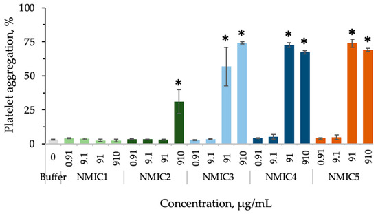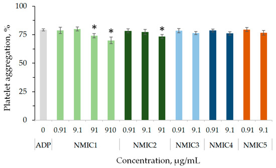 To analyze the effect on ADP-induced platelet aggregation, concentrations were selected at which no independent effect of samples on platelet aggregation was observed. A slight significant decrease in platelet aggregation in comparison with the control was observed during plasma incubation with NMIC1 and NMIC2 samples at concentrations of 91/910 µg/mL and 91 µg/mL, respectively (Figure 7).