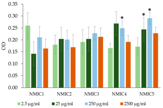The addition of the NMIC1 sample to platelet-rich human plasma with the lowest degree of substitution of 18% (0.910–910 µg/mL) did not affect platelet aggregation (Figure 6). The NMIC2 sample at a concentration of 910 µg/mL provoked platelet aggregation to 31.13 ± 8.76% (in the control 3.19 ± 0.28%). Samples of NMIC3, NMIC4 and NMIC5 did not affect platelet aggregation only at concentrations of 0.910 and 9.100 µg/mL.