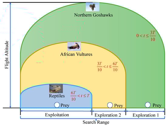 However, due to the physiological limitations of any animal, there are corresponding drawbacks to algorithms that simulate biological habits. This also leads to the RSA, like other algorithms that simulate physical patterns, having a slow convergence speed, low optimization accuracy, and being prone to falling into local optima. This article aims to solve this problem by studying the natural patterns of organisms inspired by natural laws. Crocodiles have good hunting ability as land animals but need a better observation field due to height constraints. Therefore, in the search section, the performance could be better (in line with the RSA’s slow convergence speed, low optimization accuracy, and quick fall into local optima). Inspired by the different flight heights and search horizons of natural organisms, this article introduces the African vulture optimization algorithm (AVOA) [] and northern goshawk optimization (NGO) [], utilizing the high-altitude advantages of birds to explore accordingly. Considering the sizeable spatial range, the northern goshawk algorithm is used in the high-altitude field, and African vulture optimization is used in the mid- to high-altitude range. In the exploration phase, the hunting advantages of crocodiles are utilized. On this basis, a reptile search algorithm considering different flight heights (FRSA) is proposed.
