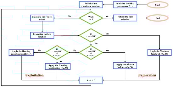 By utilizing the proposed strategy to improve the RSA, the optimization ability and efficiency of RSA can be effectively improved. The cooperative hunting mode of the FRSA is shown in Figure 2. The pseudocode of the FRSA is shown in Algorithm 2. And the flowchart of FRSA is shown in Figure 3.