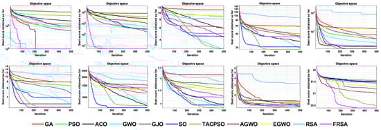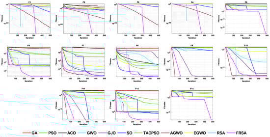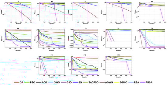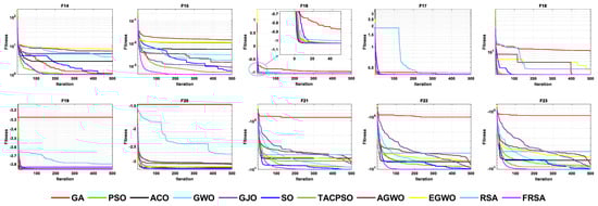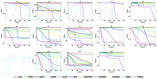 To better compare the results with other algorithms, this study used ten well-known algorithms as benchmark algorithms, including the GA [], PSO [], ACO [], GWO [], GJO [], SO [], TACPSO [], AGWO [], EGWO [], and the RSA []. These benchmark algorithms have achieved excellent results in function optimization and are often used as benchmark comparison algorithms. The details of the parameter settings for the algorithms are shown in Table 3. To be fair, the setting information for these parameters was taken from the original literature that proposed these algorithms.