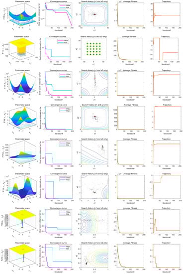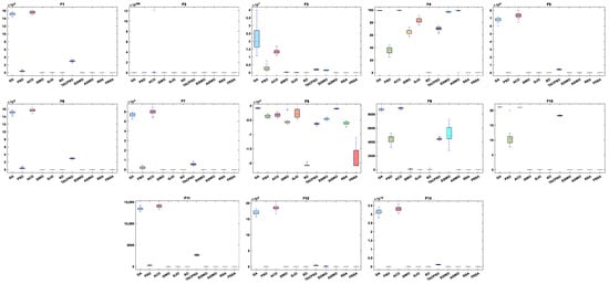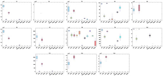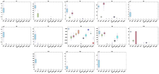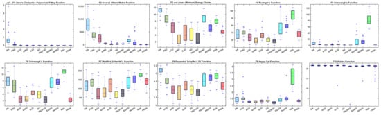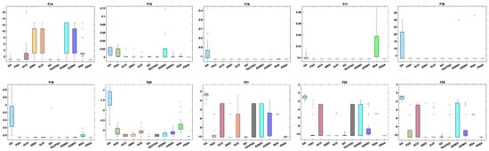 To fairly compare the results of the benchmark algorithms, all algorithms adopted the following unified parameter settings: the number of independent continuous runs of the algorithm was 30, the number of populations was 50, the number of algorithm iterations was 500, and the comparison indicators included the mean, the standard deviation, the p-value, the Wilcoxon rank sum test, and the Friedman test [,]. The best results of the test are displayed in bold. This simulation testing environment was carried out on a computer with the following features: Intel(R) Core (TM) i5-9400F CPU @ 2.90 GHz and 16 GB RAM, Windows 10, 64-bit operating system.