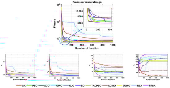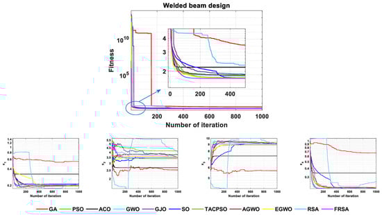 In this section, the FRSA solves three engineering design problems: pressure vessel design [,], corrugated bulkhead design [,], and welded beam design []. Including multiple variables and multiple constraints, these problems are significant practical problems and are often used to verify the performance of heuristic algorithms. These engineering design problems have become a vital aspect of the practical application of meta-heuristic algorithms. To verify the performance of the FRSA more fairly, this section used ten advanced algorithms (GA, PSO, ACO, GWO, GJO, SO, TACPSO, AGWO, EGWO, and RSA) similar to the function testing section for testing.