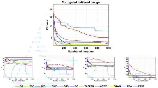 The FRSA and ten other advanced algorithms proposed in this article were solved for the corrugated bulkhead design problem. The corrugated bulkhead design values obtained by the 11 algorithms are shown in Table 13. According to the Table 13, the result obtained by the FRSA is . Among all 11 algorithms, the FRSA achieved the best result. To better demonstrate the optimization process of the 11 algorithms in the corrugated bulkhead design problem, Figure 16 shows the convergence curves of the 11 algorithms, including the FRSA. It provides the corresponding change angles for each variable to reflect the trend of differences among the parameters during multi-parameter design. To verify the robustness of the algorithm on this issue, statistical analysis was also conducted, and the relevant statistical analysis results are shown in Table 14. The Wilcoxson rank sum test counted the results of the FRSA compared with the other algorithms, and the FRSA achieved a result of 9/0/1. Through the corresponding convergence curve and statistical analysis, the FRSA converged faster, had higher accuracy, and had obvious advantages compared to the other algorithms.