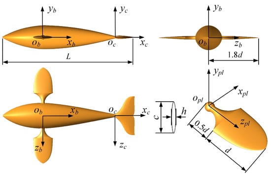 Here, we employed a dolphinlike model as the virtual swimmer. As shown in Figure 1, the swimmer was located in the coordinate system obxbybzb, and it consisted of a smooth main body, a pair of symmetrical pectoral fins and an umbrella-shaped caudal fin. The size of the swimmer was based on a model of a robotic dolphin being developed in our laboratory with a length of L = 0.3 m. Regarding the design of the pectoral fins on both sides, we installed a handle at the root of each pectoral fin and embedded it into the side of the body. Taking the left pectoral fin as an example, we defined the coordinate system oplxplyplzpl to describe its position. The left pectoral fin in the oplxplypl plane was simplified to an elliptical cross-section with width c = 0.15L, thickness h = 0.025L and chord length d = 0.2L, and the length of the handle was 0.5d. The length from the center of mass of the swimmer to the tips of the pectoral fins was 1.8d. The cross-section of the caudal fin was an NACA0024-shaped airfoil, and its active deformation was updated in the coordinate system ocxcyczc. It is necessary to note that for the swimmer, the smooth body and caudal fin together formed its BCF module, and the paired pectoral fins constituted its MPF module.