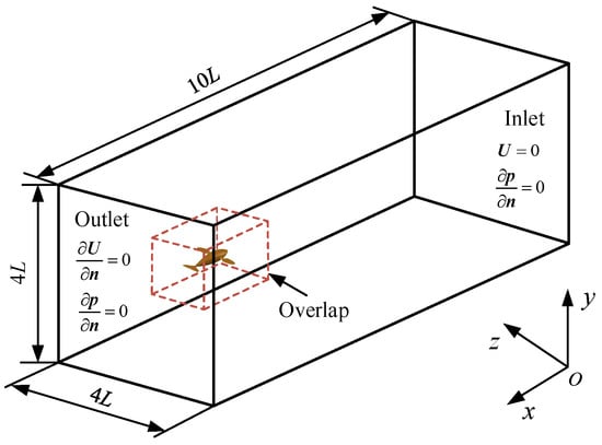 The computational domain around the swimmer was a 3D cubic water tank with a size of 10L × 4L × 4L containing a small body-fitted space with a size of 2.4L × 1.2L × 1.2L (a dotted cubic box), as shown in Figure 2. The body-fitted space and the other fluid domain were connected by the overlapping grids. The swimmer was placed 1L from the outlet, at the center of the plane formed by the lateral and vertical directions. Enough space was left longitudinally so that the swimmer could achieve self-propulsion. It should be noted that a right-handed absolute coordinate system oxyz was also established, as shown in Figure 2, where the ox axis pointed to the tail, the oy axis pointed to the top and the oz axis pointed to the side. The velocity inlet and pressure outlet constituted the boundary conditions of the incoming flow. The velocity imposed on the upstream boundary was zero, and the velocity gradient imposed on the downstream boundary and other boundaries was zero. In addition, the pressure gradient of all boundaries was zero.