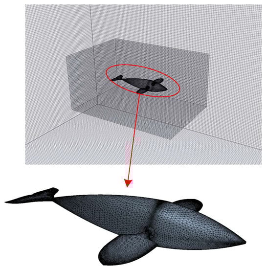 Fish swimming modes can be divided into the body and/or caudal fin (BCF) mode and the median and/or paired fin (MPF) mode []. Of these, the BCF mode has always been treated as the main enabler for the propulsion system, which has been widely reported in physical experiments [,,,] and numerical simulations [,,,]. For example, Feilich and Lauder used a mechanically driven flapping foil to study how different shapes, tail shaft depths and other factors affect swimming performance []. While meeting the fixed swing frequency, Park et al. determined the conditions to maximize the thrust generated by the compliant caudal fin propulsion system []. Yu et al. applied the multijoint caudal structure and the high-thrust control strategy to a robotic dolphin to achieve high-speed advancement and even high-power leaping movement []. Liu used a three-dimensional (3D) low Reynolds number model to analyze tadpoles’ propulsion and revealed that the shape and kinematics of the tadpole work together to create a small “dead water” region between the head and tail of the growing hind limbs []. Xia et al. relied solely on the traveling wave propulsion of the body and caudal fin to realize a self-propelled simulation, and obtained a new energy-saving exercise mode []. Chung et al. proposed a novel fluid–structure interaction model to simulate the swinging performance of the caudal fin []. Regarding the MPF mode, whether in a physical experiment or a numerical simulation, a pair of pectoral fins are installed symmetrically on both sides of the fish body [,,,,,]. In addition, Behbahani and Tan proposed a flexible passive joint to connect the pectoral fins and the fish body, and maximized its effect on propulsive performance by relying on a rapid-bending-recovery mechanism []. Xu and Wan used ultra-high-resolution grids to separate the fish and fluid domains, and realized self-propulsion based on the compound flapping of pectoral fins []. Bianchi presented a numerical model of the bullnose ray swinging motion and found that the MPF mode enables highly efficient self-propulsion []. Li and Ma once proposed a submarine propulsion with flapping wings on both sides, using the collaboration of various wings to improve the propulsion performance, and thus this design had been considered as an innovative application of the MPF mode on submarines []. Taken together, it can be found that these two swimming modes, namely, BCF and MPF, have been systematically studied as a single heuristic model; however, the potential superiority arising from their collaboration has been rarely reported.