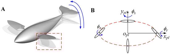 The complex marine environment contains ever-changing hydrodynamics phenomena that are waiting for humans to challenge. Whales and dolphins, which depend on the marine environment for survival, have many little-known characteristics and exhibit excellent swimming performance. Inspired by dolphins, biomimetic underwater vehicles (BUVs) have been rapidly developed with the promise of explaining hydrodynamic mechanisms and exploiting ocean resources [,,,]. Unlike submarines that rely on propellers for propulsion [,], BUVs can imitate the swimming modes of dolphins, and actively respond to the attached fluid by multifin collaborative movements, thus achieving stable and efficient propulsion. As a leader in ocean sports, dolphins have always been the embodiment of high agility and explosiveness. In a sense, imitating the kinematics of dolphins is considered the best shortcut that can be applied to the design of high-performance BUVs. The inspiration for the current study came from the interaction between the dolphin’s body and various fins, such as the pectoral, dorsal and caudal fins.