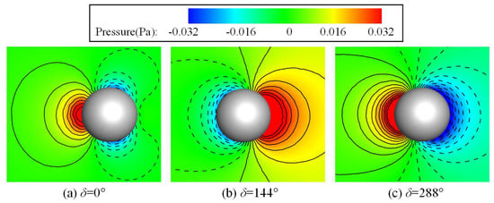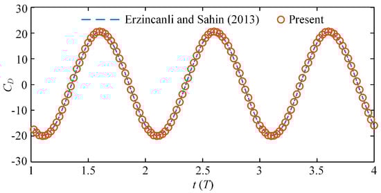 To verify the validity of the numerical method to study the comparison and collaboration of the two swimming modes in dolphins, we chose the oscillation case of a 3D sphere and calculated two sets of cases with different parameters, one identical to the work of Erzincanli and Sahin [], and the other identical to the literature Ref. [], in order to double-verify the accuracy of the numerical method. In the first case, the motion of the sphere was prescribed as , where Am = 0.125D is the oscillating amplitude, D is the diameter of the sphere, fs = 1 Hz is the oscillating frequency and the Reynolds number is taken to be Re = 20, which is the same as was used in the work of Erzincanli and Sahin. For the drag coefficient, the calculation method was the same as that in the literature, namely, , where Fx is the fluid force along the horizontal x direction and Umax is the maximum speed of the sphere. Figure 5 shows the time history variations of the drag coefficients calculated in this paper and a comparison with the results of Erzincanli and Sahin []. The results show that the drag coefficients calculated by our method are almost consistent with the results in Erzincanli and Sahin’s work. In the second case, the motion of the sphere was defined as , where Am = 0.125D and fs = 1.2732Umax/D. It is necessary to note that in this case, the Reynolds number was 78.54, based on the sphere diameter D and the maximum speed of the sphere Umax, and the Strouhal number was 1.2732. Figure 6 shows the pressure contours at three different phase angles, which are also in high agreement with the results reported in the literature to double-verify the accuracy of the numerical method in this work [].
