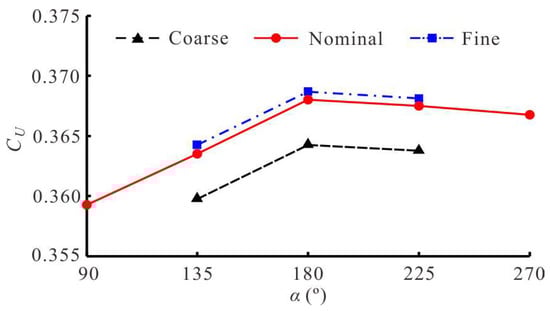 A grid convergence test was also performed to determine the appropriate discretization size. In this work, three grid sizes with uniform side lengths of 0.004L, 0.002L and 0.001L were used, and the corresponding grid numbers were 1.2 million (coarse), 5.8 million (nominal) and 12.5 million (fine), respectively. For each grid, the domain size, time step and boundary conditions were the same as those used for the nominal grid, which is the grid used for all simulation cases. In the quantitative grid convergence test, we unified the other kinematic parameters of the swimmer except for the starting phase difference α between the BCF and MPF modes, and took the value of α as 135°, 180° and 225°. Figure 7 shows the dimensionless steady-state swimming velocity CU of three different grids as a function of α. It can be observed that under the same conditions, the swimming law simulated by the coarse grid had a large error, while the nominal grid and the fine grid could better deal with the hydrodynamics of multimode collaborative cases. Therefore, the nominal grid with a uniform size of 0.002L was a suitable choice for this study.