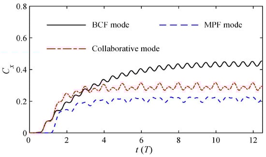 The virtual swimmer experienced a dynamic and gradual convergence process from stationary to a steady-state cruise. The collaborative mode of the swimmer was defined as the combination of the BCF and MPF modes mentioned above. This section mainly compares the propulsion effects produced by several different modes. Figure 8 shows the time history of the dimensionless instantaneous swimming velocity Cx obtained at the same frequency in BCF mode, MPF mode and collaborative mode, respectively. The results show that the MPF mode based on the paired pectoral fins produces the lowest steady velocity with a faster convergence acceleration, while the BCF mode with the body and caudal fin module produces the largest steady velocity at the same frequency. The final cruise speed was converted to 2.25BL/s in measurement unit of body length (BL), which meets the swimming speed range of normal dolphins in nature []. The most difficult to analyze are the variation trends produced by the collaborative mode. In the initial stage of the startup, the collaborative explosive force of the two modes has the greatest acceleration and quickly converges. However, at the inflection point after convergence, the steady velocity gradually stabilizes, which is slower than that of single BCF-mode propulsion. From this point, it can be inferred that on the basis of the BCF mode, the MPF mode produces resistance rather than thrust when the swimmer enters the steady state. Therefore, we wondered if the resistance effect of the MPF mode could be converted into a thrust effect, and if so how it could be converted. These are two very enlightening questions.