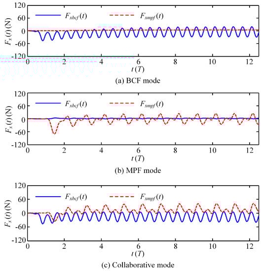 To explain the reason why the steady velocity of the collaborative mode is lower than that of the single BCF mode, Figure 9 shows the convergence of the fluid forces generated by three different modes along the advancing direction, i.e., the negative x axis direction. Obviously, in a single mode, that is, the BCF mode or the MPF mode, the resistance of the static part of the swimmer is greater than zero and fluctuates in a small range. The working part plays a role in accelerating the propulsion, and thus, the generated fluid force gradually fluctuates around a negative value near zero after reaching the steady state, corresponding to the velocity curve of the swimmer moving forward smoothly, as shown in Figure 8. For the collaborative mode, both the BCF and MPF modules play a positive role in the initial stage. However, after reaching the stable stage, the fluid force generated by the MPF module gradually becomes resistance, which exactly explains the reason why the steady velocity of the collaborative mode is lower than that of the single BCF mode under the same frequency. From this, it can be inferred that stacking the MPF module is not the best way to improve the propulsion performance of the swimmer in collaborative mode. On the contrary, swimmers in MPF mode have better maneuverability and stability than those in BCF mode. Therefore, we believe that the MPF module has more advantages in the 3D maneuvering motion of swimmers, which is the direction of our future research.