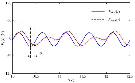 Obviously, the BCF and MPF modes play different roles in the swimmer’s propulsion. To distinguish their respective contributions, Figure 10 shows the instantaneous fluid force generated by these two modes after the swimmer reaches the steady state. It can be observed that in the MPF mode, the swimmer reaches the maximum thrust at n + 0.5T, while in the BCF mode, the maximum thrust value of the swimmer occurs at both n + 0.4T and n + 0.9T, which means that in the BCF mode, the swimmer can alternately generate the maximum thrust twice in one cycle, where n denotes the n-th movement cycle in the self-propulsion process. It is necessary to note that when the instantaneous fluid force reaches a negative maximum value, it is considered to have reached the maximum thrust force at this time. For the convenience of description, here we define the time interval between the two modes to generate the maximum thrust value in a single cycle as the starting phase difference α, in which the BCF mode is activated prior to the MPF mode. The influence of the starting phase difference α on the propulsion performance in the collaborative mode is further discussed below.