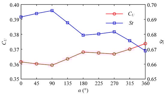 To answer the two questions posed above, we tried to change the starting phase difference between the BCF and MPF modes to improve the collaborative effect of the latter. Figure 11 shows the effect of the starting phase difference α on the dimensionless steady-state swimming velocity CU and the Strouhal number St. The entire curve of CU presents an upward retracement trend and eventually stabilizes, while the law of St curve is the opposite. Careful observation shows that when the starting phase difference is a multiple of 180°, the dimensionless steady-state velocity CU reaches its maximum value, while St is at the trough value during one cycle. At this point, both the BCF and MPF modes are at the moment when they generate the maximum thrust. In both half-cycles, the value of CU first linearly decreases with the increase of α, then linearly increases after reaching the inflection point. With the continuous increase of α, it means that the starting time of the MPF mode is continuously delayed, with the result that the pectoral fins in the acceleration phase will not provide too much resistance; therefore, the value of CU will gradually increase and converge to the maximum steady-state velocity generated by the BCF mode. Regarding the variation of the St number, the overall fluctuation range of its value is between 0.6 and 0.7. With the continuous increase of α, the value of St gradually decreases and approaches stability, while CU changes in the opposite direction. The law of the two complementary changes is consistent with the experimental conclusions on the oscillating wing [].