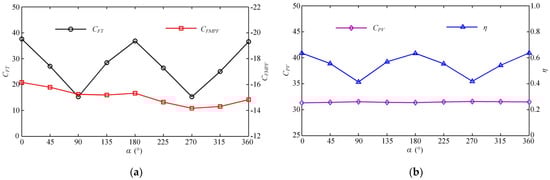 Furthermore, Figure 12a shows the variation of the average thrust force coefficient CFT with the starting phase difference α after the swimmer enters the steady state. As α increases gradually, CFT fluctuates up and down. When α is a multiple of 180°, the BCF and MPF modes that generate the maximum thrust can create better resonance. The value of CFT at this time reaches its largest. At the moment when α is a multiple of 90°, the work of the two modes does not collaborate well, and the propulsion effect produced by their combination is relatively weak. It should be noted that in our simulation, the swimmer’s body and caudal fin constitute the BCF module, and a pair of pectoral fins constitutes the MPF module, each with its own motion mode. Figure 12a also shows the average fluid force coefficient produced by the MPF mode in the steady state. It can be seen that at the same frequency, the BCF mode plays a significant role in propulsion, while the MPF mode does not meet our propulsion expectations but plays a role of resistance. It is consistent with the time history of the fluid forces generated by the MPF mode shown in Figure 9c. The change rule of the starting phase difference shows that as the starting time of the pectoral fins is delayed, the resistance generated by the MPF mode decreases. This result indirectly confirms that the lagging effect of the MPF mode at the same frequency helps to increase the steady-state swimming velocity of the later cruise.