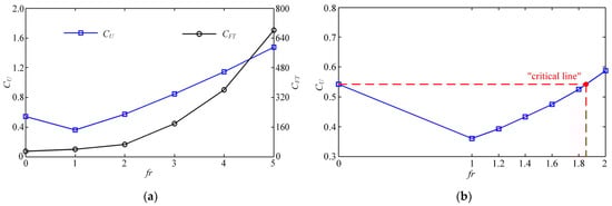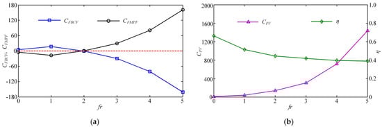 In addition, to explore the potential superiority of the collaboration between the two modes and reduce the adverse impact of MPF mode on propulsion, we tried to increase the stroke frequency of MPF mode and kept the swing frequency of BCF mode constant. Here, the frequency ratio β of MPF mode and BCF mode is defined to describe the collaborative work of high-frequency MPF motion. Figure 13a shows the variations of dimensionless steady-state velocity CU and overall thrust force coefficient CFT with the frequency ratio β changing from 0 to 5. With the increase of β, CU increases slowly, and CFT increases with a steeper growth trend after gradually increasing. It is necessary to explain that when β = 0, the swimmer is in the state of single BCF propulsion. Closer observation of Figure 13a shows that CU when β = 2 slightly exceeds the value of CU when β = 0, and the stroke of the MPF mode becomes beneficial at this time. As β further increases, the value of CU rises linearly, which proves that the dual-mode collaboration with a certain frequency ratio can obtain a better propulsion effect. This is a very interesting phenomenon that has not been reported elsewhere.