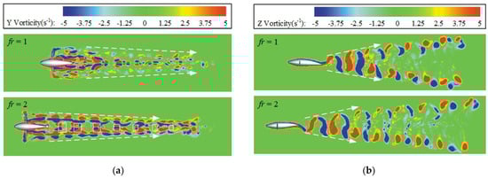As shown in Figure 16b, the oxy section can only express the vorticity generated by the BCF module, including two diffuse vortex streets. This conclusion is consistent with the previous wake vortex structure reported in the single BCF propulsion [,]. Since the swing of the caudal fin is fixed and the basic frequency is unchanging, the value of frequency ratio β does not affect the overall layout of the vortex street generated by the caudal fin. However, as the value of β increases, the steady swimming velocity of the swimmer increases, and therefore the longitudinal spacing of the vortex street gradually becomes larger.