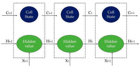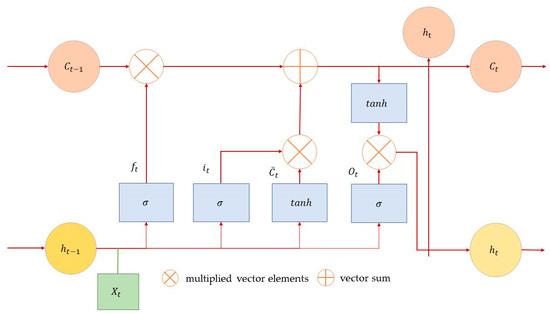 Long short-term memory (LSTM) is an extension of the recurrent neural network (RNN) that can solve the problem of long-term dependency that RNN cannot handle. LSTM introduces a “gate” mechanism with which it solves the problem of gradient vanishing or explosion and, therefore, it is often used to deal with time series data prediction problems. The LSTM network is mainly composed of input gates, forget gates, output gates, cell states, and hidden states. Among them, the input gate determines the number of unit states to be sent, the forgetting gate determines the number of inputs to the current cell state, the output gate determines the cell state output to the hidden state, the cell state refers to the internal memory of the LSTM cell, and the hidden state refers to the external hidden state [35]. The structure of LSTM is shown in Figure 1, with inputs at time t consisting of X t , H t 1 , C t 1 , and outputs at time t consisting of H t , C t .
