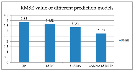 As shown in Figure 5, the SARIMA-LSTM-BP model was compared with three single prediction models, namely BP, LSTM, and SARIMA, and it can be seen that the RMSE of the SARIMA-LSTM-BP model was lower than that of any single model. Based on the RMSE values, it can be concluded that the SARIMA-LSTM-BP model provided more accurate predictions than BP, LSTM, or SARIMA.