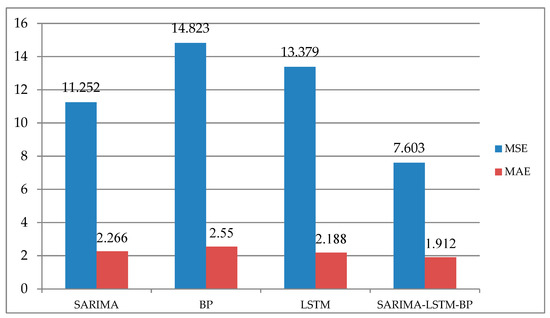 As shown in Figure 6, both the MSE and MAE values of the SARIMA-LSTM-BP model were superior to those of the single prediction models. In this study, the SARIMA-LSTM-BP model obtained the lowest MSE and MAE values during prediction, further demonstrating its superiority among the four prediction models.
