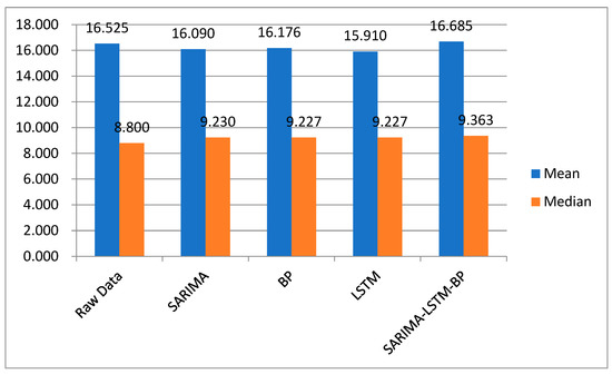 Due to the different time steps involved in different models, the number of predicted values for each model was not the same. Therefore, we selected the monthly forecast data of new energy vehicles from 2015 to 2022 for different models to ensure the fairness of the experiment. As shown in Figure 7, the mean and median of the predicted data sets for each model were very close to the mean and median of the original data. The data show that the SARIMA-LSTM-BP model had the closest mean to the mean of the raw data, proving that this model performed the best. The median was sensitive to the distribution of the data set and outliers. Since this experiment’s data set was subject to seasonal fluctuations and contained many outliers, the median fluctuation of the SARIMA-LSTM-BP model was not optimal, but within a reasonable range. Therefore, considering all indicators, it was sufficient to prove that the performance of the SARIMA-LSTM-BP model is better than other models.