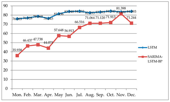 Different deep learning prediction models also have different prediction results. In this study, LSTM and SARIMA-LSTM-BP, two prediction models with good performance, were selected to predict the sales volume of new energy vehicles for the next 12 months, as shown in Figure 8. The SARIMA-LSTM-BP model not only considered the influence of seasons on the sales of new energy vehicles, but also took into account the accurate prediction ability of the deep learning prediction model. The prediction results show that the demand for new energy vehicles will generally show an upward trend with in the next year. Among them, May and November were the peak periods of local growth. Starting in July, the predicted demand for new energy vehicles in each month of the second half of the year was above 650,000 units, and supply chain production companies can reasonably produce according to this predicted quantity and make sufficient preparations for production and sales in the second half of the year.